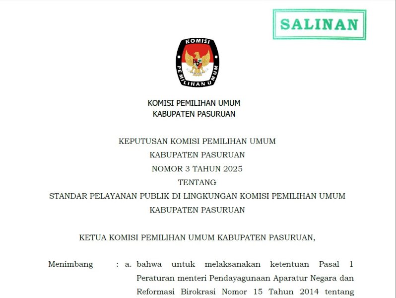 Komisi Pemilihan Umum (KPU) Kabupaten Pasuruan telah menetapkan Surat Keputusan Nomor 3 Tahun 2025 tentang Standar Pelayanan.