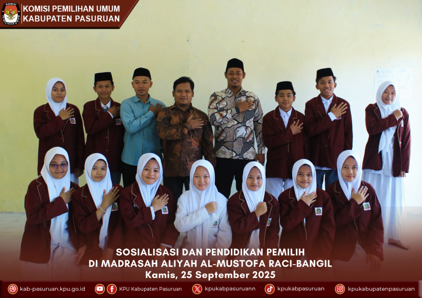 Pasuruan – Komisi Pemilihan Umum (KPU) Kabupaten Pasuruan terus menggencarkan kegiatan sosialisasi dan pendidikan pemilih, salah satunya dengan menyasar pemilih pemula di lingkungan sekolah. Pada kesempatan kali ini, kegiatan dilaksanakan di Madrasah Aliyah (MA) Al-Mustofa Raci-Bangil, dengan peserta para siswa-siswi yang akan segera memasuki usia memilih pada pemilu mendatang.