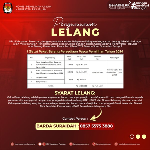Komisi Pemilihan Umum (KPU) Kabupaten Pasuruan akan melaksanakan Lelang Barang Non Eksekusi Wajib berupa Barang Milik Negara (BMN) Persediaan Pasca Pemilihan Tahun 2024 berupa Surat Suara dan Sampul Eks Pemilihan melalui perantara Kantor Pelayanan Kekayaan Negara dan Lelang (KPKNL) Sidoarjo. Penawaran dilakukan secara elektronik tanpa kehadiran peserta lelang melalui website www.lelang.go.id