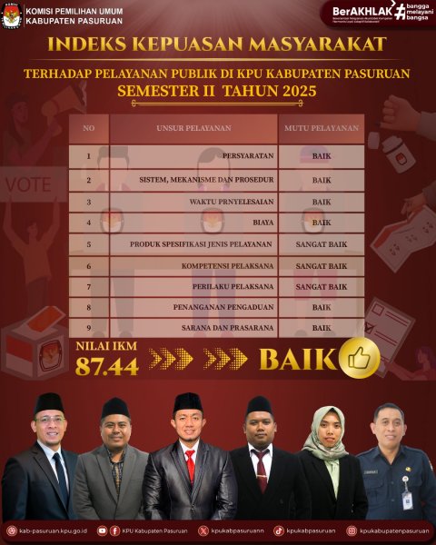 Berdasarkan hasil survei tersebut, KPU Kabupaten Pasuruan memperoleh nilai IKM sebesar 87.44 dengan kategori mutu pelayanan ‘Baik’. Hasil ini menunjukkan bahwa pelayanan publik yang diberikan telah berjalan dengan baik dan dirasakan manfaatnya oleh masyarakat.