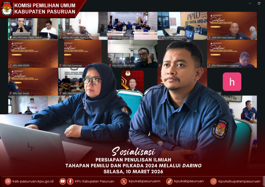 Pasuruan, kab-pasuruan.kpu.go.id — Komisi Pemilihan Umum (KPU) Kabupaten Pasuruan mengikuti kegiatan Sosialisasi Persiapan Penulisan Ilmiah Tahapan Pemilu dan Pilkada 2024 yang dilaksanakan secara daring pada Selasa (10/3/2026). Kegiatan ini diikuti oleh jajaran KPU kabupaten/kota se-Jawa Timur sebagai bagian dari upaya mendokumentasikan pengalaman penyelenggaraan tahapan Pemilu dan Pilkada 2024 dalam bentuk karya tulis ilmiah yang sistematis dan bermanfaat bagi pengembangan kepemiluan.