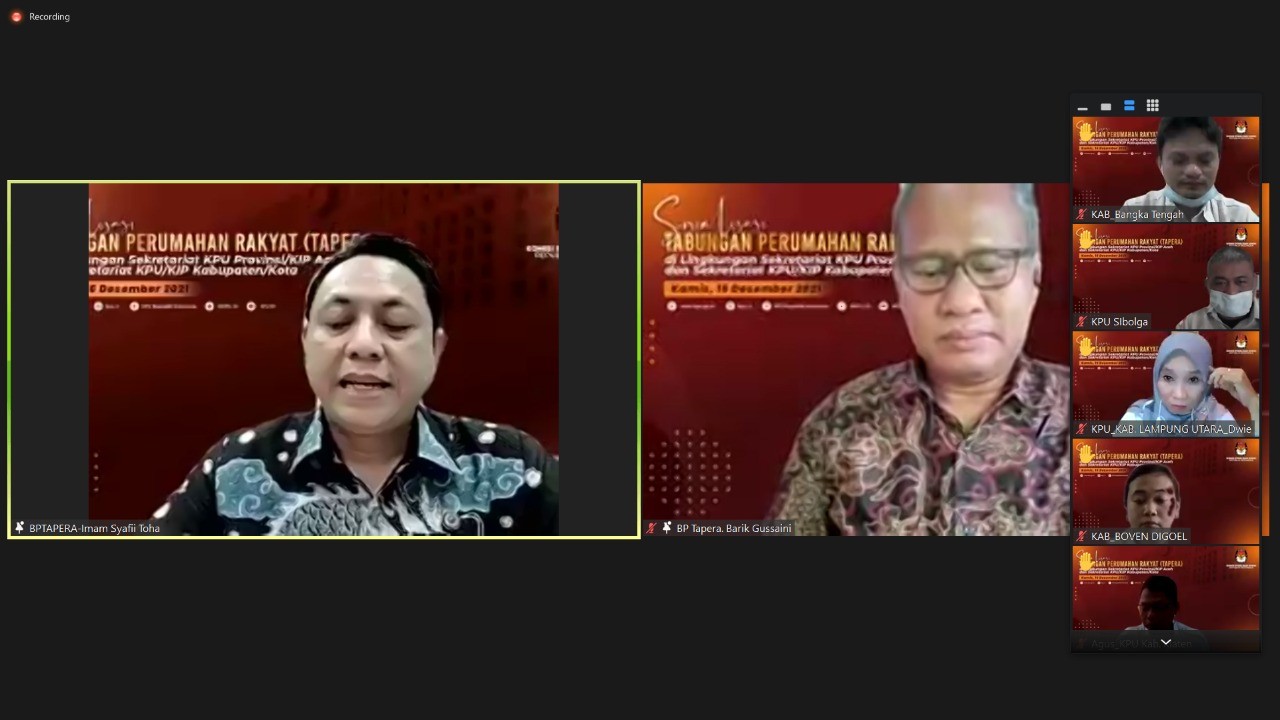 Pasuruan, kab-pasuruan.kpu.go.id - Kamis (16-12-2021) Komisi Pemilihan Umum Republik Indonesia mengadakan Rapat Sosialisasi Tabungan Perumahan Rakyat (TAPERA) di Lingkungan Sekretariat KPU Provinsi/KIP Aceh dan Sekretariat KPU/KIP Kabupaten/Kota. Acara rapat sosialisasi diikuti seluruh jajaran ASN di lingkungan Sekretariat KPU Provinsi/KIP Aceh dan Sekretariat KPU/KIP Kabupaten/Kota se-Indonesia.