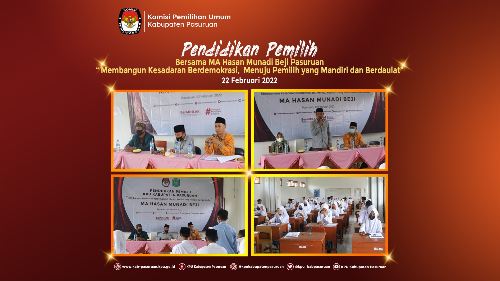 Pendidikan pemilih bersama MA Hasan Munadi ini merupakan salah satu upaya KPU Kabupaten Pasuruan dalam meningkatkan peran serta masyarakat dalam menyongsong Pemilu dan Pemilihan Serentak Tahun 2024, dengan memprioritaskan pemilih pemula.