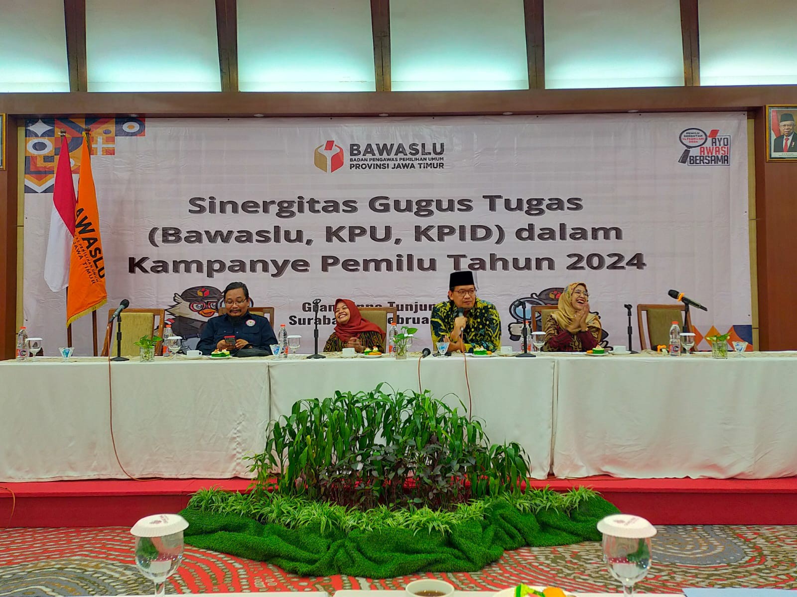 Badan Pengawas Pemilu Provinsi Jawa Timur menggelar rapat koordinasi dengan tema sinergitas gugus tugas (Bawaslu, KPU, KPID) dalam kampanye pemilu tahun 2024, Senin, (5/2/2024) yang diselenggarakan di Grand Inna Tunjungan, Surabaya.