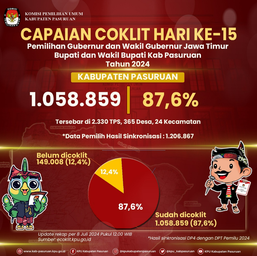 Berikut adalah Capaian Coklit Hari ke-15 Pemilihan Gubernur dan Wakil Gubernur Jawa Timur, Bupati dan Wakil Bupati Kabupaten Pasuruan Tahun 2024.