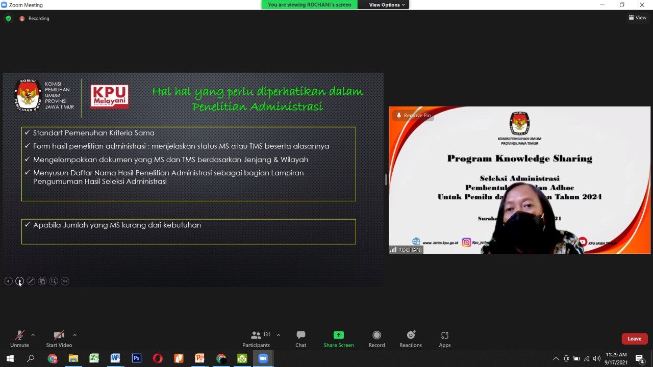 Pasuruan, kab-pasuruan.kpu.go.id – KPU Provinsi Jawa Timur mengadakan Program Knowledge Sharing Pembentukan Badan Adhoc Untuk Pemilu dan Pemilihan Tahun 2024 dengan tema ‘Seleksi Administrasi Pembentukan Badan Adhoc Pemilu dan Pemilihan 2024’ via Zoom meeting (17/09/2021). Dimulai pukul 09.00 WIB, kegiatan diikuti oleh Anggota KPU Kabupaten/Kota Divisi Sosdiklih, Parmas dan SDM, serta Kasubag Keuangan, Umum dan Logistik dari 38 KPU Kabupaten/Kota se-Jawa Timur.
