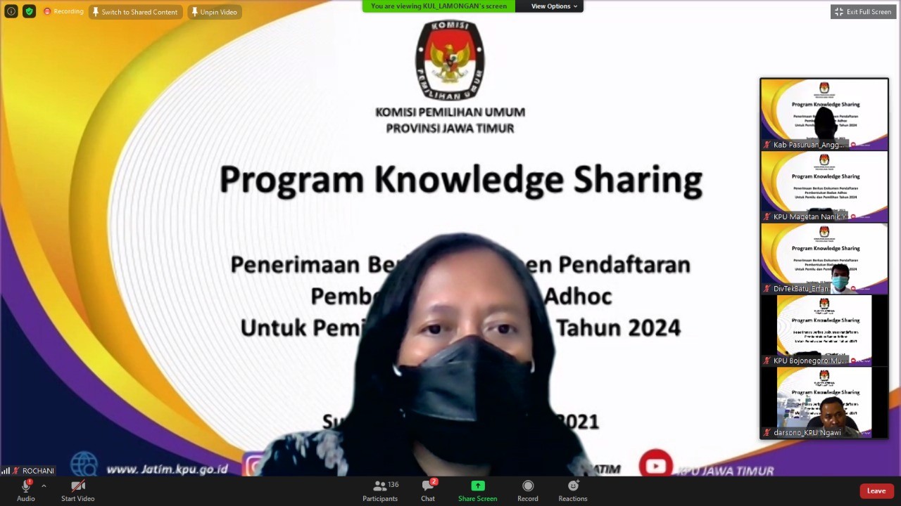 Pasuruan, kab-pasuruan.kpu.go.id – Memasuki edisi ketiga, Rabu (15/09/2021) Knowledge Sharing bersama 38 KPU Kabupaten/Kota se-Jawa Timur membahas tema Penerimaan Berkas Dokumen Pendaftaran Pembentukan Badan Adhoc Untuk Pemilu dan Pemilihan Tahun 2024. Menghadirkan narasumber Sunfy Fahlawati (Anggota KPU Kabupaten Bondowoso), Khoirul Anam (Anggota KPU Kabupaten Lamongan) selaku pembahas dan bertindak sebagai moderator Fahrurozhi Mashuri (Plt. Kasubag Keuangan, Umum dan Logistik KPU Kabupaten Bondowoso).