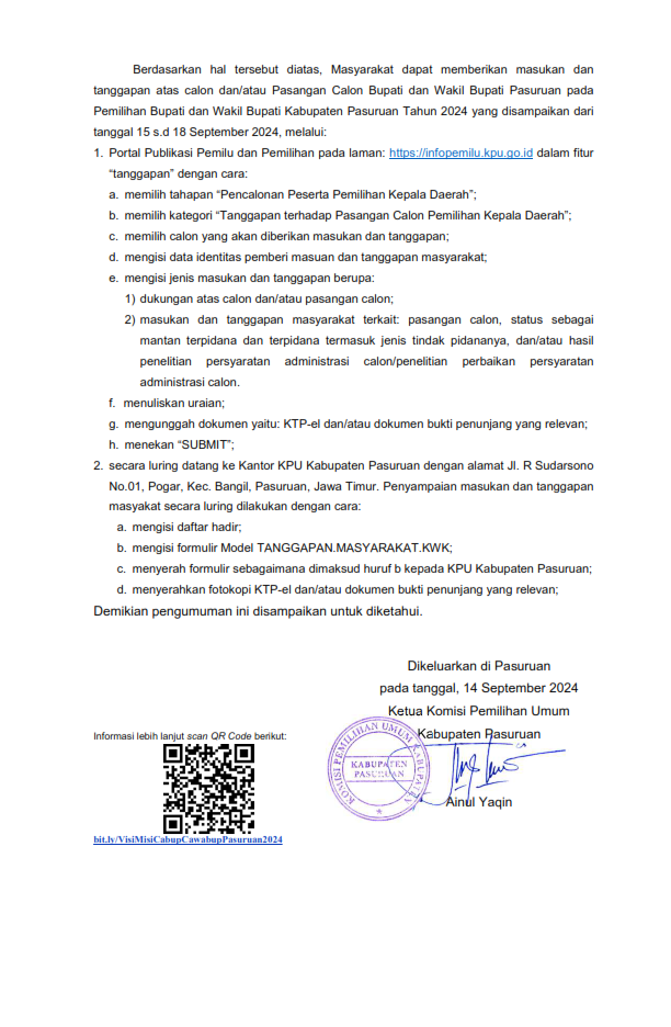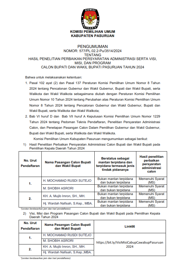 HASIL PENELITIAN PERBAIKAN PERSYARATAN ADMINISTRASI SERTA VISI, MISI, DAN PROGRAM CALON BUPATI DAN WAKIL BUPATI PASURUAN TAHUN 2024