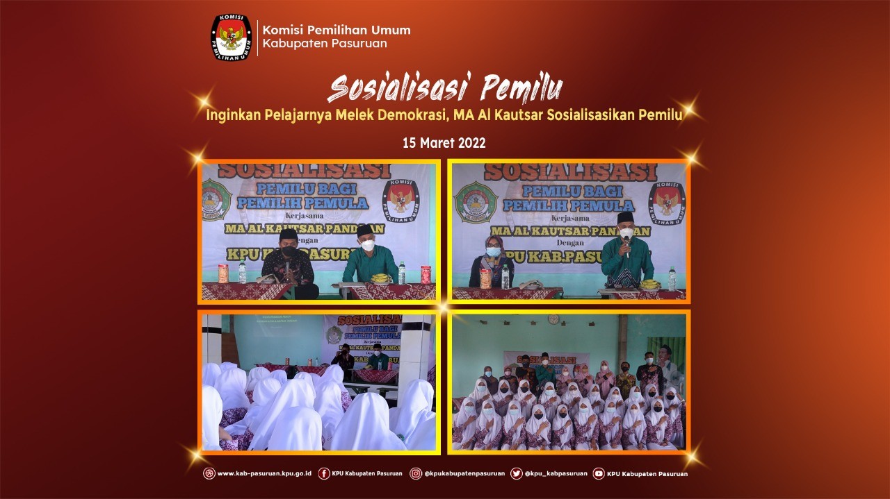 Pasuruan, kab-pasuruan.kpu.go.id - Selasa (15-03-2022), Komisi Pemilihan Umum (KPU) Kabupaten Pasuruan menghadiri undangan MA Al Kautsar, yang bertempat di Jl. Pondok Pesantren Al Kautsar, Lingkungan Dukuh, Kutorejo - Pandaan, untuk memberikan edukasi kepada pelajar tentang pemilihan umum.