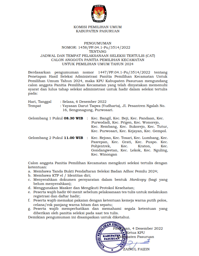 Jadwal dan Tempat Pelaksanaan Seleksi Tertulis (CAT) Calon Anggota Panitia Pemilihan Kecamatan (PPK) untuk Pemilihan Umum Tahun 2024