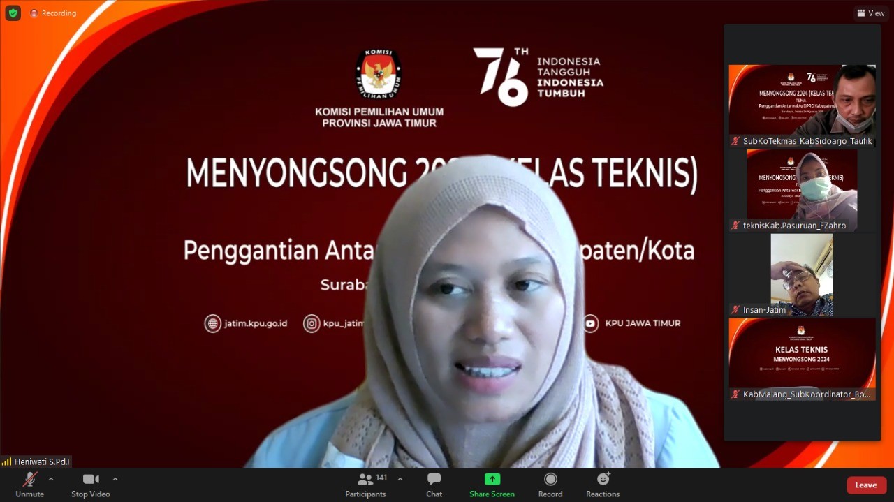 Pasuruan, kab-pasuruan.kpu.go.id – Selasa (24/08/2021) memasuki pertemuan kesepuluh ruang diskusi Kelas Teknis secara virtual yang diselenggarakan Komisi Pemilihan Umum (KPU) Provinsi Jawa Timur, mengambil tema Penggantian Antar Waktu (PAW) Anggota DPRD Kabupaten/Kota yang diikuti oleh Divisi Teknis Penyelenggara dan Sub Koordinator Teknis dan Hupmas KPU Provinsi Jawa Timur dan KPU Kabupaten/Kota se - Jawa Timur.