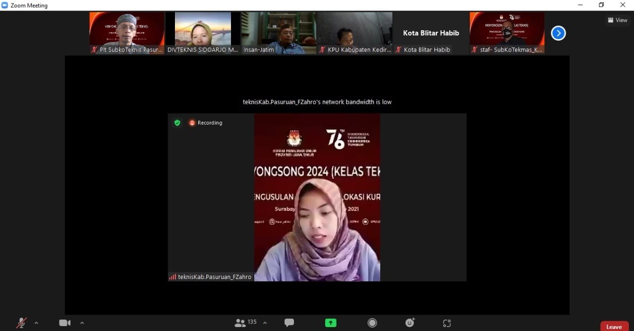 Pasuruan, kab-pasuruan.kpu.go.id – Kamis (26/08/2021) ruang diskusi Kelas Teknis secara virtual yang diselenggarakan Komisi Pemilihan Umum (KPU) Provinsi Jawa Timur telah memasuki pertemuan kesebelas. Tema yang diangkat dalam ruang diskusi terkait Pengusulan Dapil (Daerah Pemilihan) dan Alokasi Kursi pada Pemilihan Umum, yang diikuti oleh Divisi Teknis Penyelenggara dan Sub Koordinator Teknis dan Hupmas KPU Provinsi Jawa Timur dan KPU Kabupaten/Kota se - Jawa Timur.