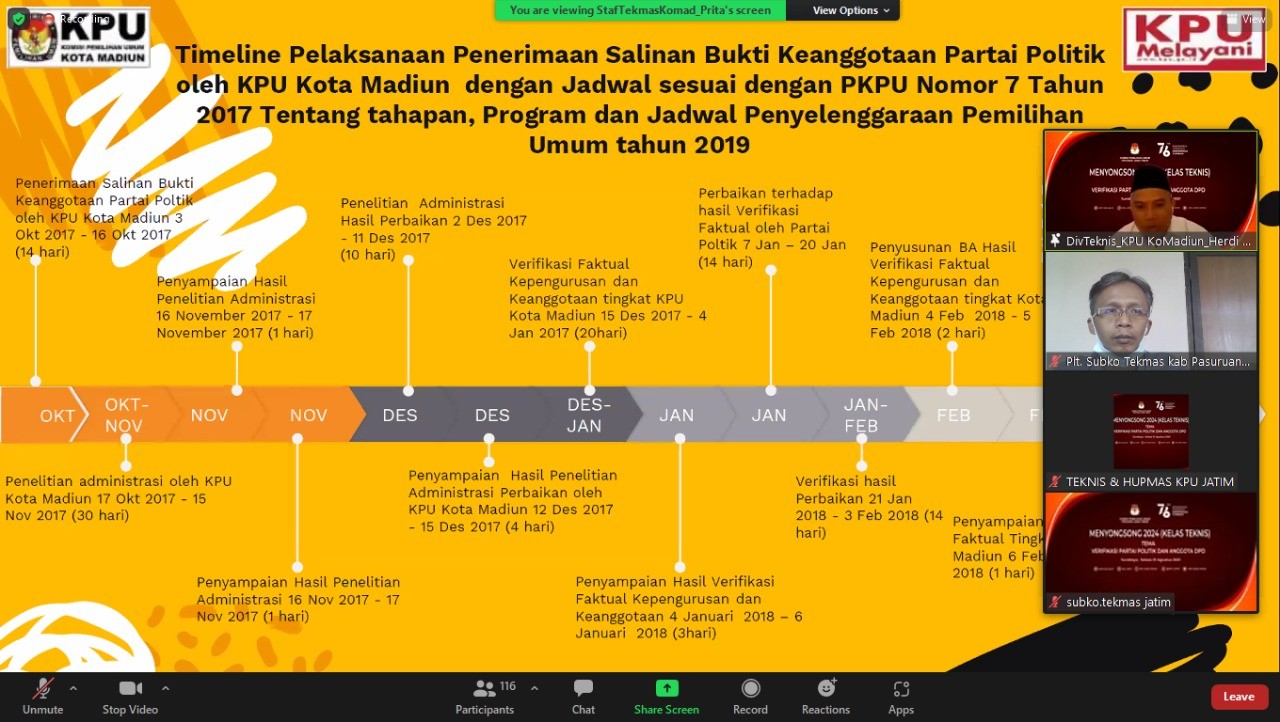Pasuruan, kab-pasuruan.kpu.go.id – Selasa (31/08/2021) memasuki pertemuan keduabelas ruang diskusi Kelas Teknis secara virtual yang diselenggarakan Komisi Pemilihan Umum (KPU) Provinsi Jawa Timur, mengambil tema Verifikasi Partai Politik dan Anggota DPD yang diikuti oleh Divisi Teknis Penyelenggara dan Sub Koordinator Teknis dan Hupmas KPU Provinsi Jawa Timur dan KPU Kabupaten/Kota se - Jawa Timur.