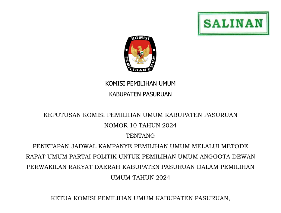 Keputusan Komisi Pemilihan Umum (KPU) Kabupaten Pasuruan Nomor 10 Tahun 2024 tentang Penetapan Jadwal Kampanye Pemilihan Umum melalui Metode Rapat Umum Partai Politik untuk Pemililhan Umum Anggota Dewan Perwakilan Rakyat Daerah Kabupaten Pasuruan dalam Pemilihan Umum Tahun 2024 Unduh disini