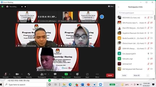 Pasuruan, kab-pasuruan.kpu.go.id- Rabu (29/09/2021) KPU Kabupaten Pasuruan kembali mengikuti program Knowledge Sharing Pembentukan Badan Adhoc untuk Pemilu dan Pemilihan 2024 bersama dengan KPU Provinsi Jawa Timur dan KPU Kabupaten/Kota secara virtual melalui zoom meeting. Bahasan yang diusung pada edisi ke-7 kali ini adalah Pengumuman Hasil Seleksi Administrasi Pembentukan Badan Adhoc Pemilu dan Pemilihan Serentak 2024.