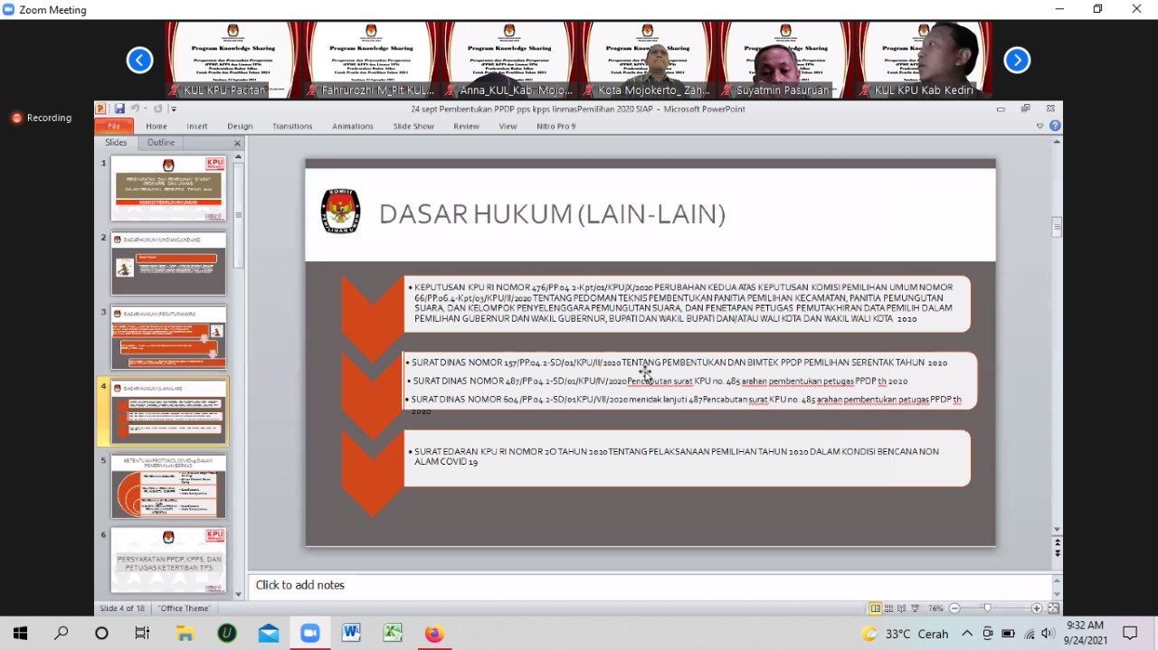 Pasuruan, kab-pasuruan.kpu.go.id- Rabu (22/09/2021) KPU Kabupaten Pasuruan kembali mengikuti program Knowledge Sharing Pembentukan Badan Adhoc untuk Pemilu dan Pemilihan 2024 bersama dengan KPU Provinsi Jawa Timur dan KPU Kabupaten/Kota secara virtual melalui zoom meeting. Bahasan yang diusung pada edisi ke-5 kali ini adalah Persyaratan dan Pemenuhan Syarat PPDP, KPPS dan dan Linmas TPS) Pembentukan Badan Adhoc Untuk Pemilu dan Pemilihan Tahun 2024.