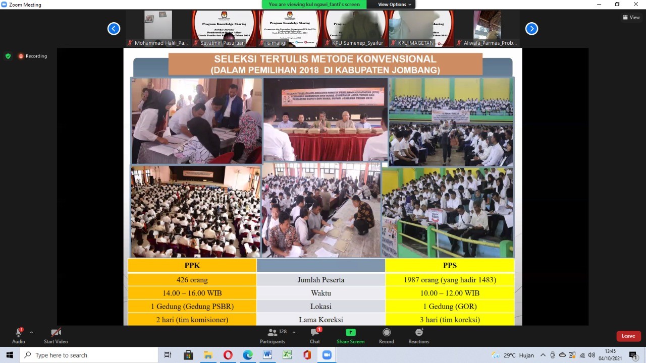 Tema inilah yang diusung oleh KPU Provinsi Jawa Timur dalam program knowledge sharing Edisi kedelapan bersama KPU Kabupaten/Kota se Jawa Timur hari ini (Senin, 04/10/2021). Dengan bahasan Seleksi Tertulis Pembentukan Badan Adhoc Untuk Pemilu dan Pemilihan Tahun 2024, acara ini diselenggarakan secara daring via zoom meeting dan dimulai tepat pukul 13.00 WIB.