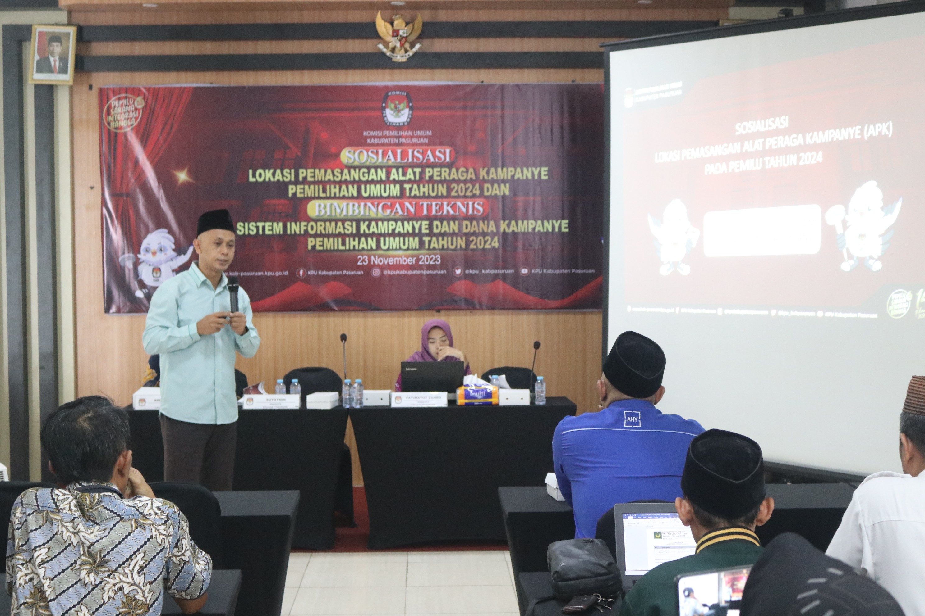 Pasuruan, kab-pasuruan.kpu.go.id – Komisi Pemilihan Umum (KPU) Kabupaten Pasuruan menggelar Sosialisasi Lokasi Pemasangan Alat Peraga Kampanye (APK) Pemilihan Umum Tahun 2024 dan Bimbingan Teknis Sistem Informasi Kampanye dan Dana Kampanye (SIKADEKA) Pemilihan Umum Tahun 2024. Kamis, (23/11/2023) yang bertempat di Kantor KPU Kabupaten Pasuruan.