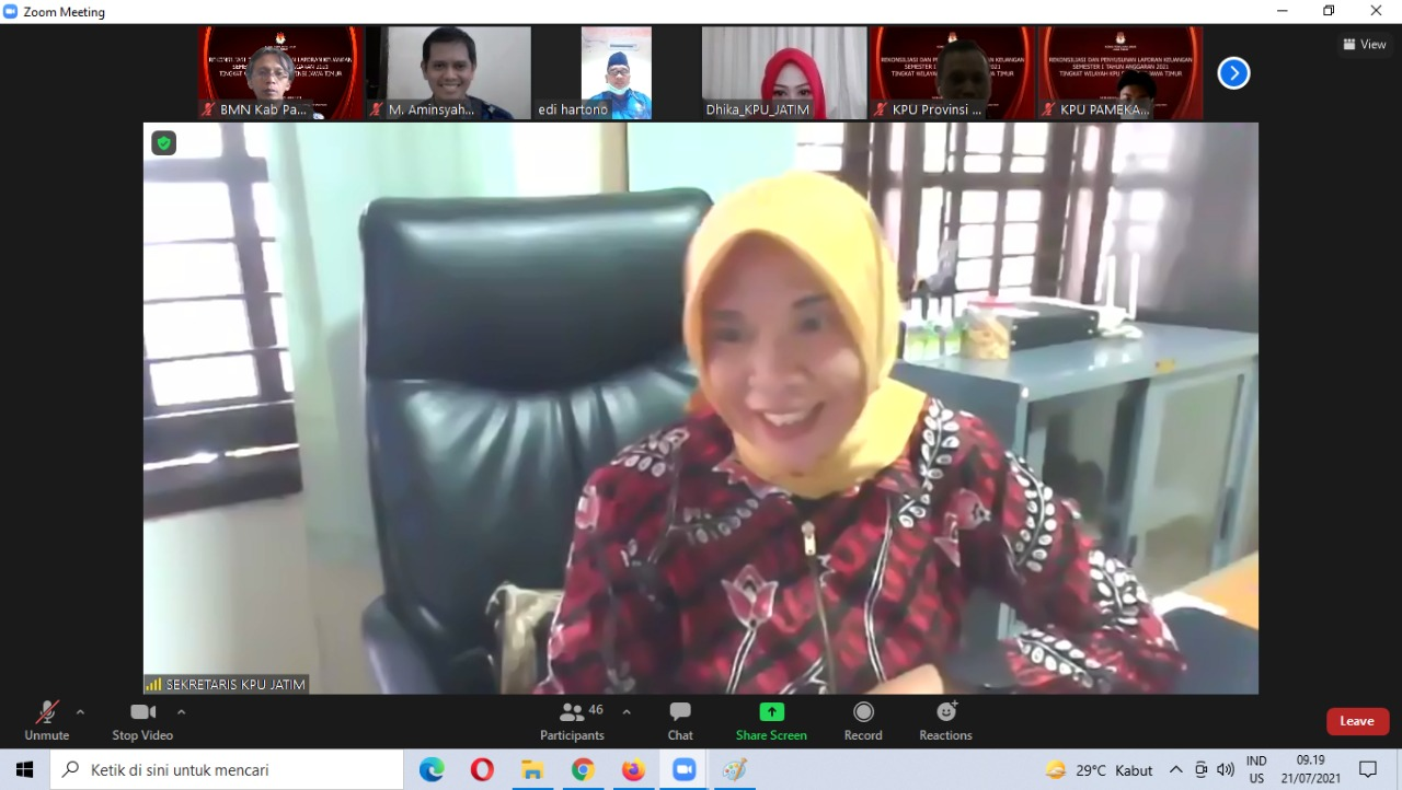 Pasuruan, kab-pasuruan.kpu.go.id – Rabu (21/07/2021) Komisi Pemilihan Umum (KPU) Provinsi Jawa Timur mengadakan Adakan Rekonsiliasi dan Penyusunan Laporan Keuangan Semester I Tahun 2021 Tingkat Wilayah. Rapat diadakan secara daring melalui zoom meeting, mengingat kondisi pandemi Covid-19 serta pemberlakuan PPKM Darurat Jawa – Bali. Acara digelar selama 2 (dua) hari, mulai 21 – 22 Juli 2021, mulai pukul 09.00 WIB – selesai.