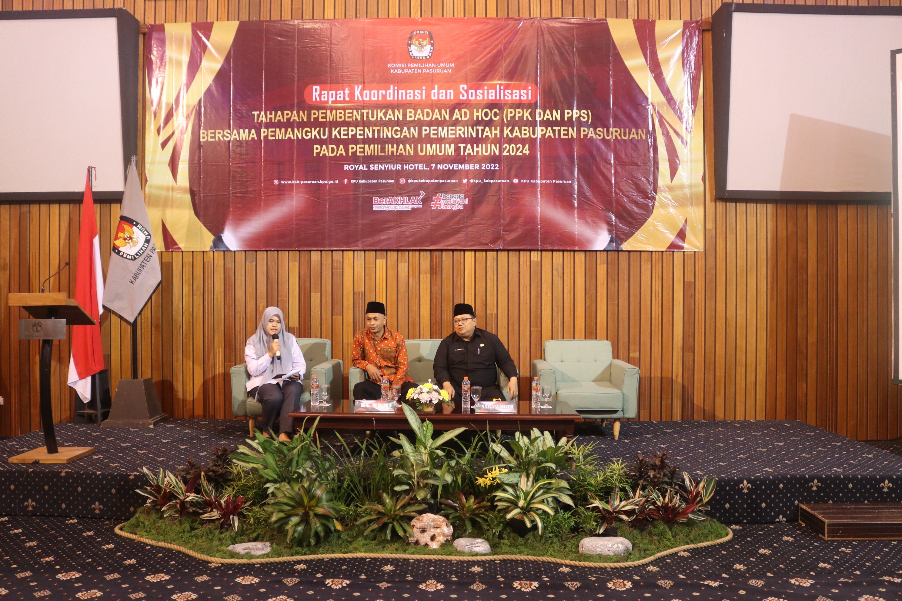 Pasuruan, kab-pasuruan.kpu.go.id - Komisi Pemilihan Umum Kabupaten Pasuruan menggelar Rapat Koordinasi dan Sosialisasi Pembentukan Badan Ad Hoc Senin, (07/11/222), mulai pukul 13.30 WIB, di Hotel Royal Senyiur, Prigen, Pasuruan, dengan dihadiri oleh Komisioner, Sekretaris beserta seluruh jajaran sekretariat KPU Kabupaten Pasuruan. Dari unsur pemerintah kabupaten, dihadiri oleh Asisten 1 Bidang Pemerintahan dan Kesra Pemerintah Kabupaten Pasuruan, Dinas Kesehatan, Dinas Kominfo, dan Jajaran Camat se-Kabupaten Pasuruan.