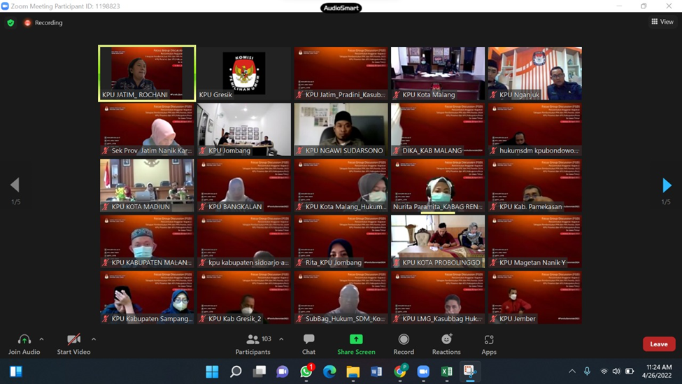 Pasuruan, kab-pasuruan.kpu.go.id-Rabu (26/4/2022) Dalam Rangka Persiapan Pembentukan PPK dan PPS Pemilu 2024, KPU Provinsi Jawa Timur mengadakan kegiatan Focus Group Discussion (FGD) Pencermatan Anggaran dan Kegiatan Tahapan Pembentukan PPK dan PPS Pemilu Tahun 2024 KPU Provinsi dan KPU Kabupaten/Kota Se-Jawa Timur yang diselenggarakan secara daring mulai pukul 10.00 WIB.