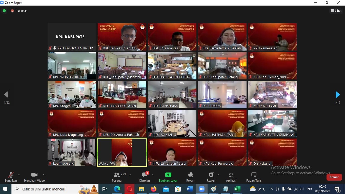 Pasuruan, kab-pasuruan.kpu.go.id – Komisi Pemilihan Umum Kabupaten Pasuruan pada Kamis (08/09/2022) mengikuti kegiatan Asistensi Penyusunan dan Evaluasi SKP PNS Tahun 2022 yang diselenggarakan oleh KPU RI secara daring mulai pukul 09.00 WIB., dengan peserta seluruh Pegawai Negeri Sipil (PNS) di lingkungan Sekretariat KPU Kabupaten / Kota Se- Jawa Timur, KPU Kabupaten/Kota Se-Provinsi DIY, KPU Kabupaten/Kota Se-Provinsi Bali, dan KPU Kabupaten/Kota Se- Jawa Tengah.