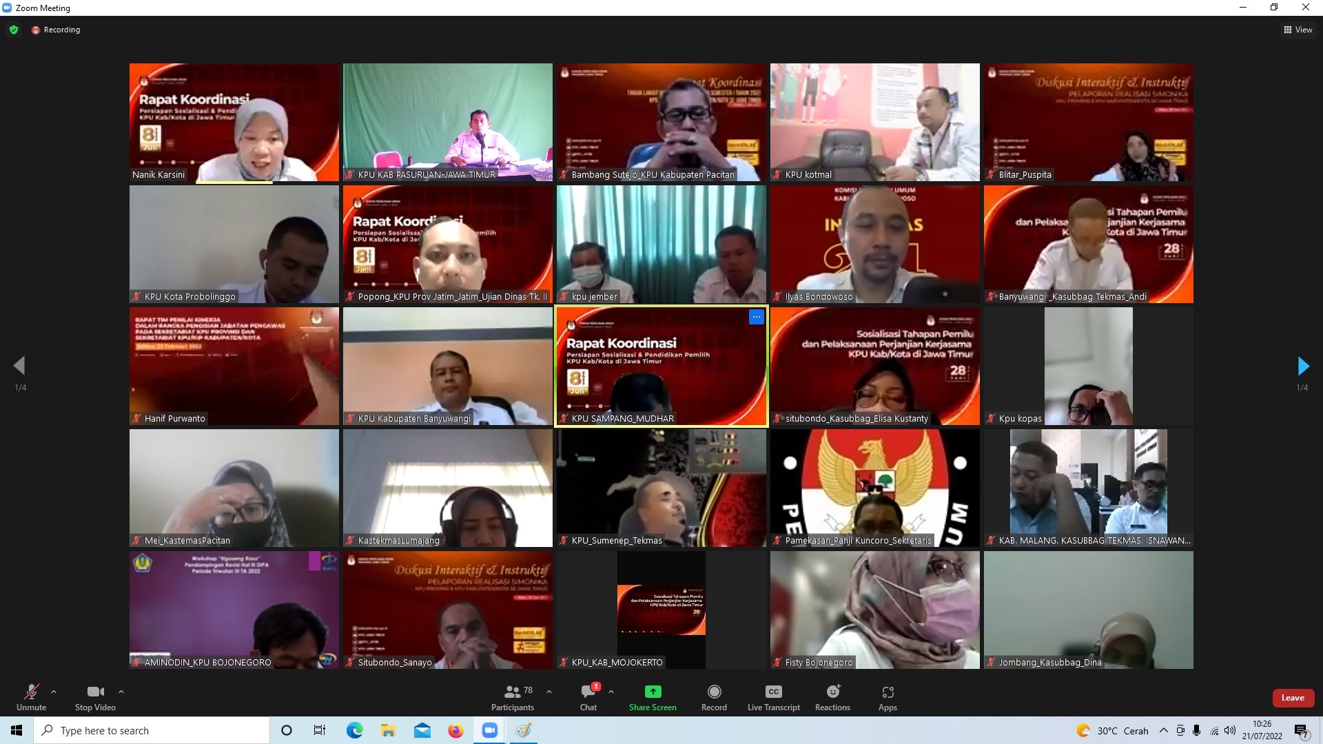 (www.kab-pasuruan.kpu.go.id) - Menindaklanjuti surat Undangan KPU RI No 611/PL.01.1-SD/05/2022 perihal pelaksanaan Bimbingan Teknis ( Bimtek ) Peraturan KPU tentang Pendaftaran, Verifikasi dan Penetapan Partai Politik Peserta Pemilu, dan Pengenalan Fungsi Sistem Informasi Partai Politik ( Sipol ) yang akan dilaksanakan di Jakarta pada tanggal 22 sampai dengan 25 Juli 2022, KPU Provinsi Jawa Timur mengadakan Rapat Koordinasi ( Rakor ) dengan peserta seluruh Sekretaris dan Kasubbag Teknis dari 38 KPU Kabupaten/Kota Se-Jawa Timur pada hari Kamis, 21 Juli 2022.