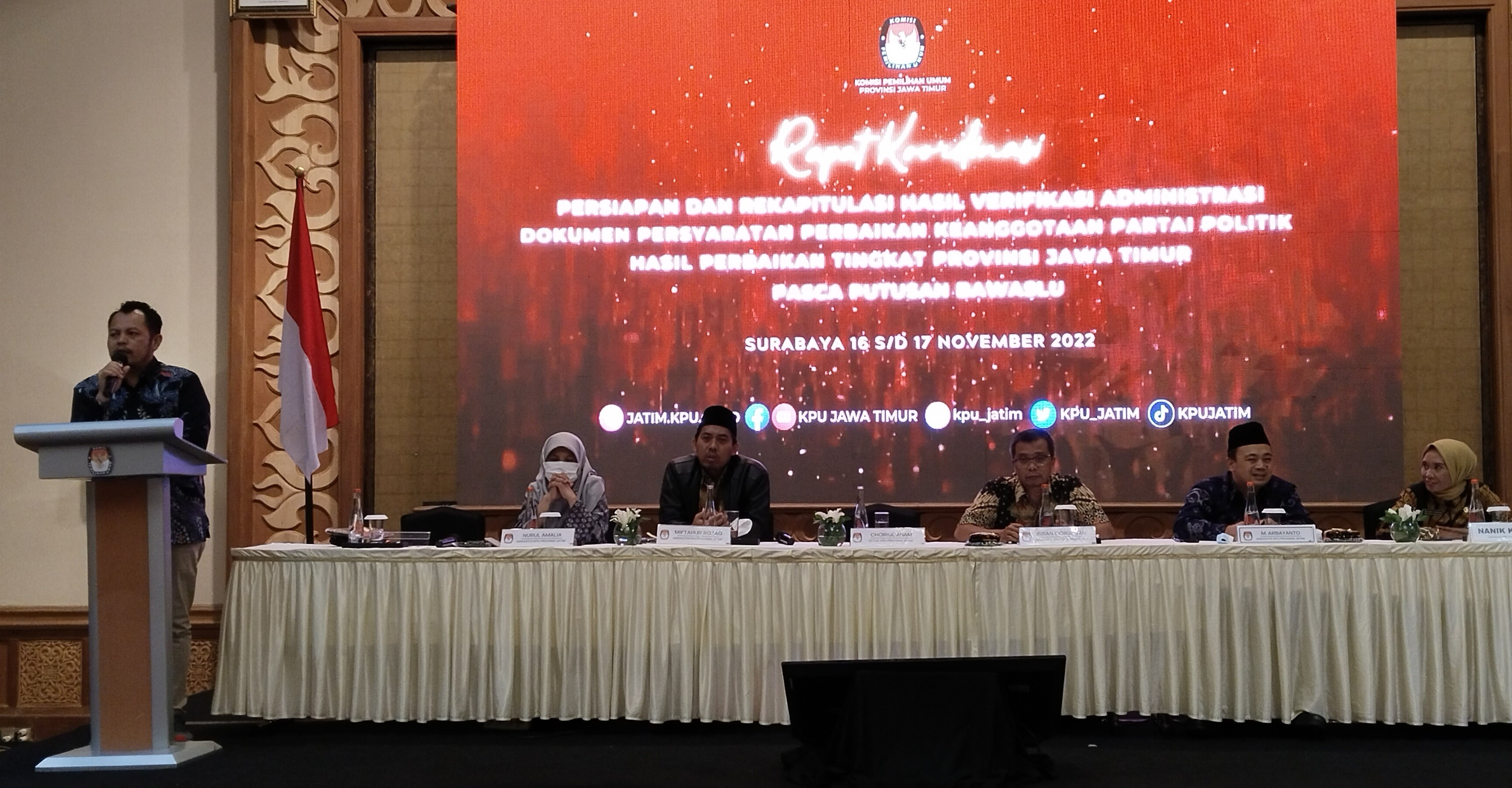 Ketua KPU Kabupaten Pasuruan, Zainul Faizin, Divisi Teknis Penyelenggara Fatimatuz Zahro, Kasubbag Teknis Anik Farida dan Admin Sipol Adi Setyawan mengikuti seluruh kegiatan Rekapitulasi hasil verifikasi administrasi dokumen persyaratan perbaikan keanggotaan partai politik hasil perbaikan tingkat provinsi Jawa Timur pasca putusan Bawaslu sampai dengan selesai pada pukul 11.00 WIB. (Ad1)