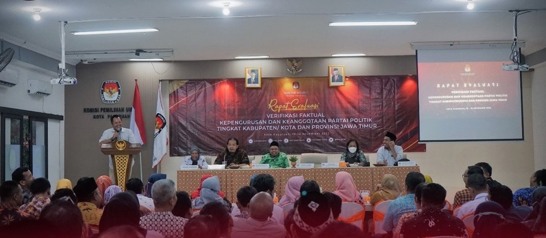 Pasuruan - https://kab-pasuruan.kpu.go.id/ . Komisi Pemilihan Umum Kabupaten Pasuruan mengkuti Rapat Evaluasi Verifikasi Faktual Kepengurusan dan Keanggotaan Partai Politik (Parpol) Tingkat Kabupaten/Kota dan Provinsi Jawa Timur yang dilaksanakan di Ruang Pertemuan Lantai 2 KPU Kota Pasuruan, jalan Panglima Sudirman Nomor 119 Kota Pasuruan pada 10 – 12 November 2022 dengan peserta Divisi Teknis Penyelenggara, Kasubbag Teknis dan dan admin/verifikator Sistem Informasi Politik (Sipol) 38 KPU Kabupaten / Kota Se-Jawa Timur. Pembukaan Rapat Evaluasi yang dimulai pada pukul 15.00 Wib dengan dihadiri jajaran Komisioner KPU Jatim , Choirul Anam, Gogot Cahyo Baskoro, Insan Qoriawan, Rochani, Miftahur Rozaq Serta dari sekretariat hadir Sekretaris, Nanik Karsini, Kabag Tekmas, Popong Anjarseno, Kasubag Teknis Penyelenggaraan Pemilu, Eddy Prayitno, beserta staf bagian Tekmas.