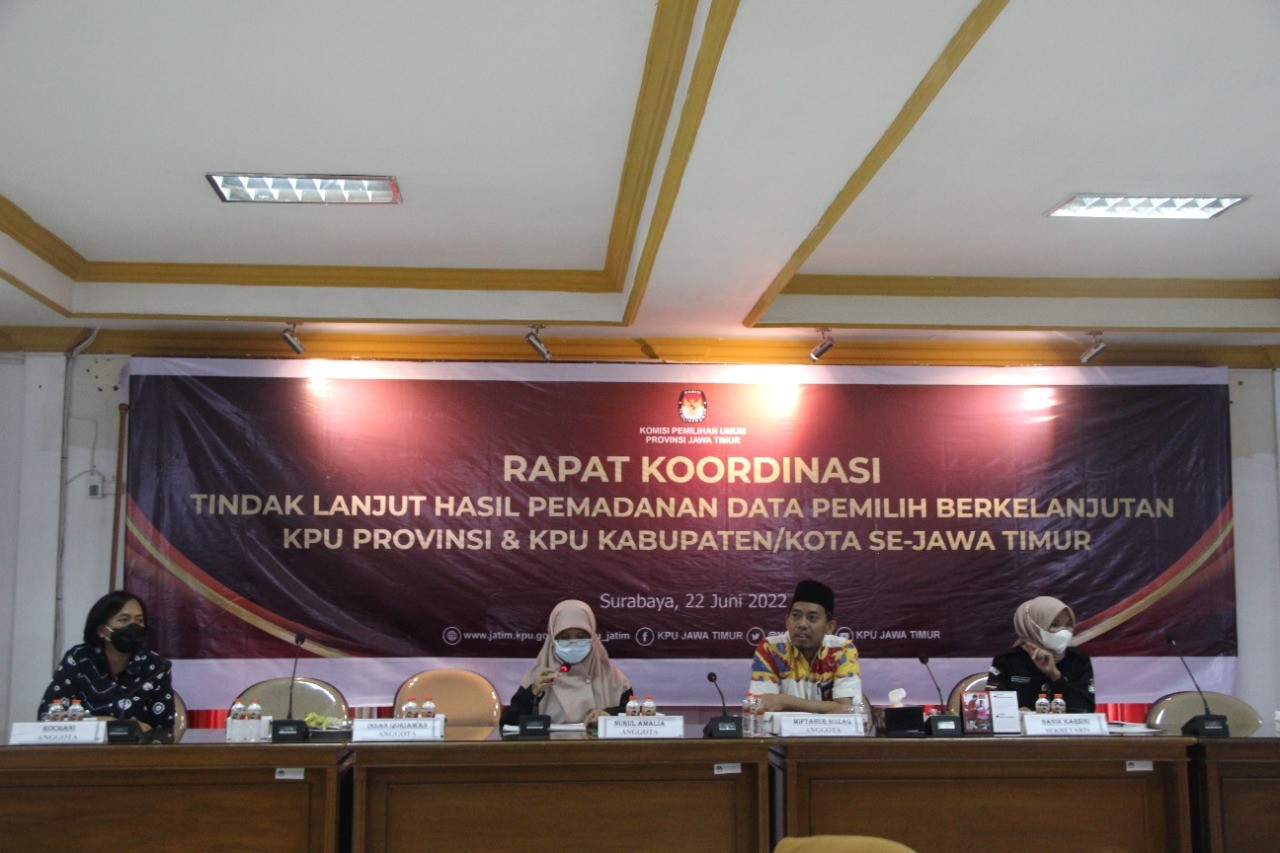 Pasuruan, kab-pasuruan.kpu.go.id - Rabu (22-06-2022). Dalam rangka menindaklanjuti surat KPU RI No 17 Tahun 2022 tentang tindak lanjut lanjut hasil pemadanan data pemilih berkelanjutan, KPU Provinsi Jawa Timur mengadakan Rapat Koordinasi Tindak Lanjut Hasil Pemadanan Data Pemilih Berkelanjutan dengan seluruh Komisioner Divisi Perencanaan, Data dan Informasi KPU Kabupaten/Kota Se-Jawa Timur, Acara yang diselenggarakan pada 22 Juni 2022 ini dimulai pukul, 10.00 WIB di Kantor KPU Provinsi Jawa Timur.