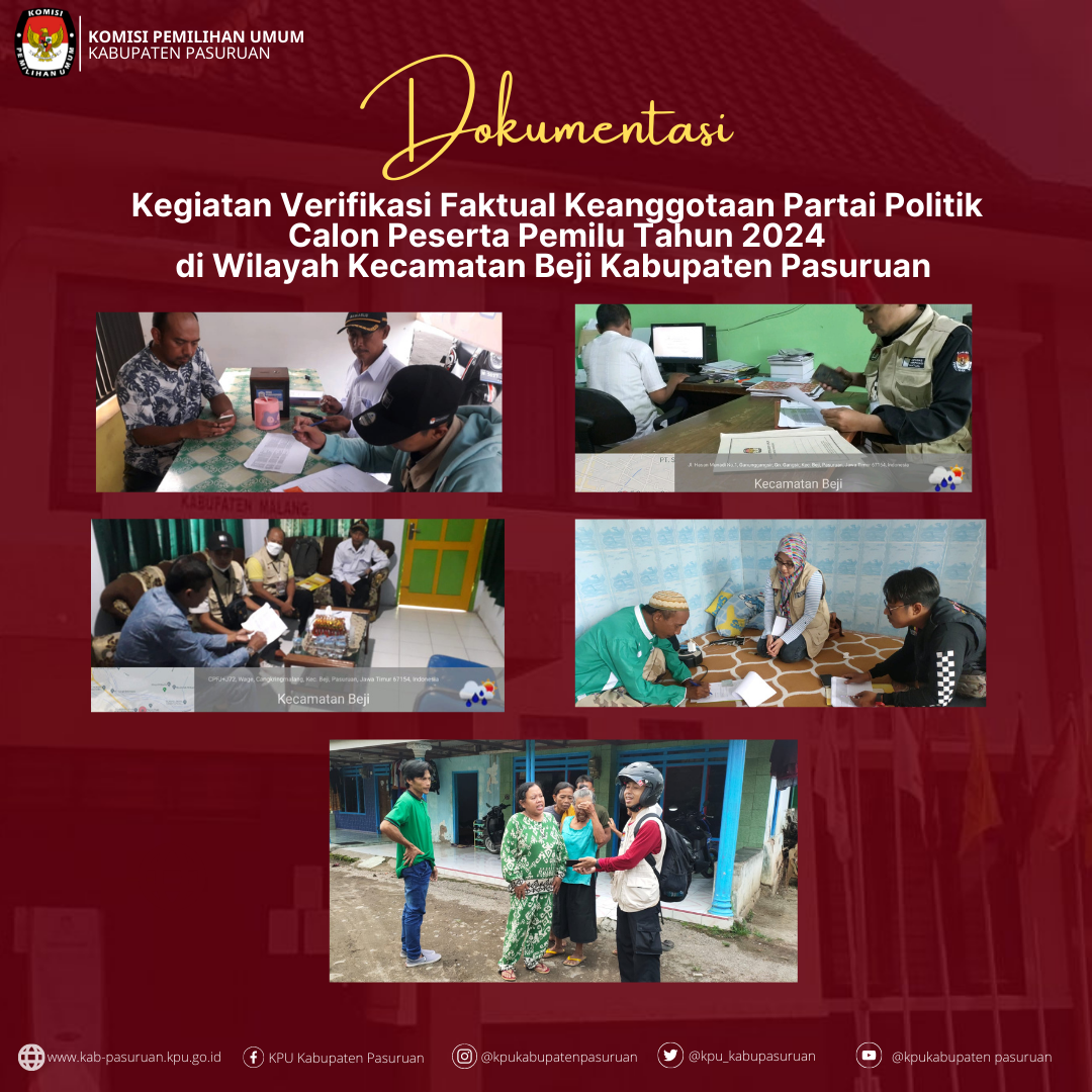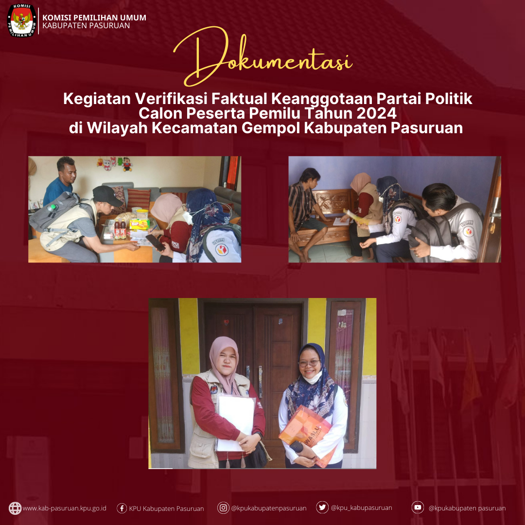 Bangil - Komisi Pemilihan Umum Kabupaten Pasuruan secara maraton melaksanakan verifikasi faktual kepengurusan dan Keanggotaan Partai Politik calon Peserta Pemilu Tahun 2024 di wilayah kerja Kabupaten Pasuruan yang telah lolos verifikasi administrasi. Terdapat 8 Partai Politik Calon Peserta Pemilu 2024 yang memiliki kepengurusan di Kabupaten Pasuruan diantaranya Perindo, Partai Ummat, Partai Solidaritas Indonesia , Partai Kebangkitan Nusantara, Partai Hati Nurani Rakyat, Partai Garda Perubahan Indonesia, Partai Buruh dan Partai Bulan Bintang. Pelaksanaan verifikasi faktual kepengurusan sudah dilakukan sejak hari Minggu hingga Senin (16-17 Oktober 2022) dilanjutkan verifikasi keanggotaan parpol yang akan dilaksanakan hingga 4 November 2022.