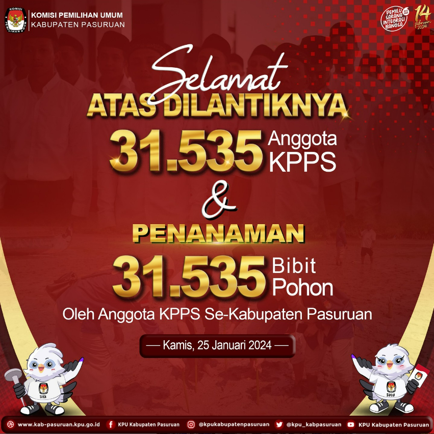 #TemanPemilih Segenap Jajaran KPU Kabupaten Pasuruan mengucapkan Selamat atas dilantiknya 31.535 Anggota KPPS & Penanaman 31.535 Bibit Pohon oleh Anggota KPPS se-Kabupaten Pasuruan. Kamis,(25/1/2024).
