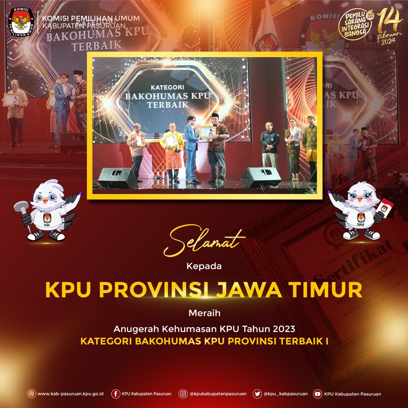 #TemanPemilih KPU Kabupaten Pasuruan mengucapkan selamat kepada KPU Provinsi Jawa Timur telah meraih Anugerah Kehumasan KPU Tahun 2023 Kategori Bakohumas KPU Provinsi Terbaik I