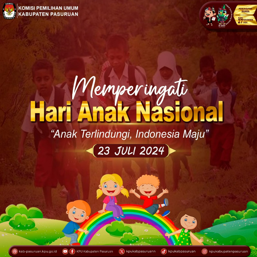segenap jajaran Komisi Pemilihan Umum (KPU) Kabupaten Pasuruan mengucapkan Selamat memperingati Hari Anak Nasional. Selasa, 23 Juli 2024.