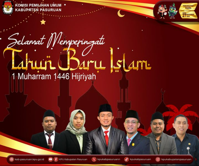 segenap jajaran Komisi Pemilihan Umum (KPU) Kabupaten Pasuruan mengucapkan Selaamat Memperingati Tahun Baru Islam 1 Muharram 1446 Hijriyah.