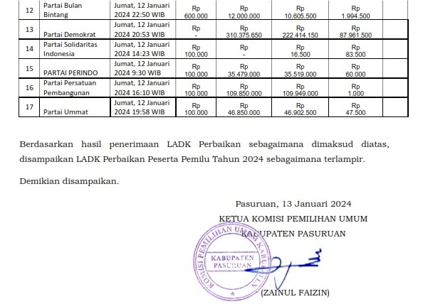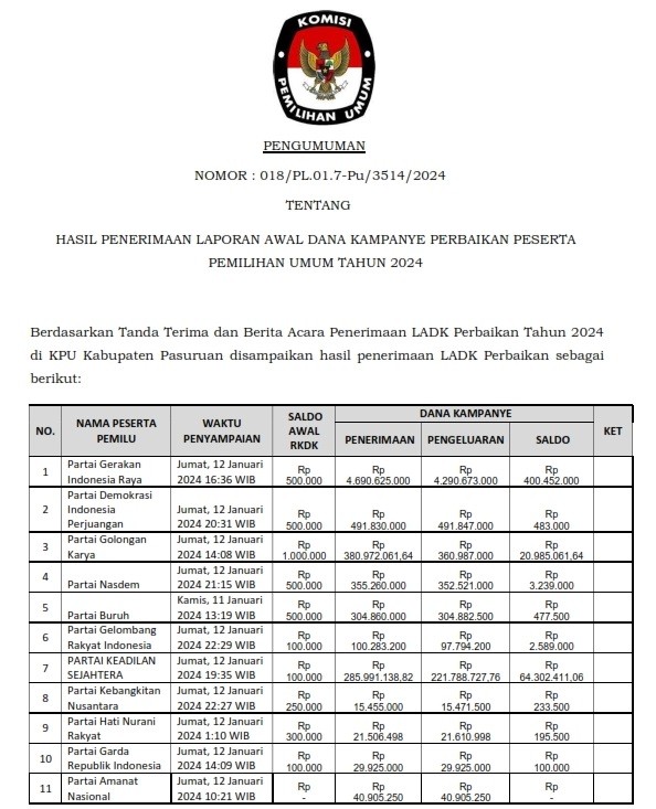 KPU Kabupaten Pasuruan mengumumkan Hasil Penerimaan LADK Perbaikan Peserta Pemilu Tahun 2024.