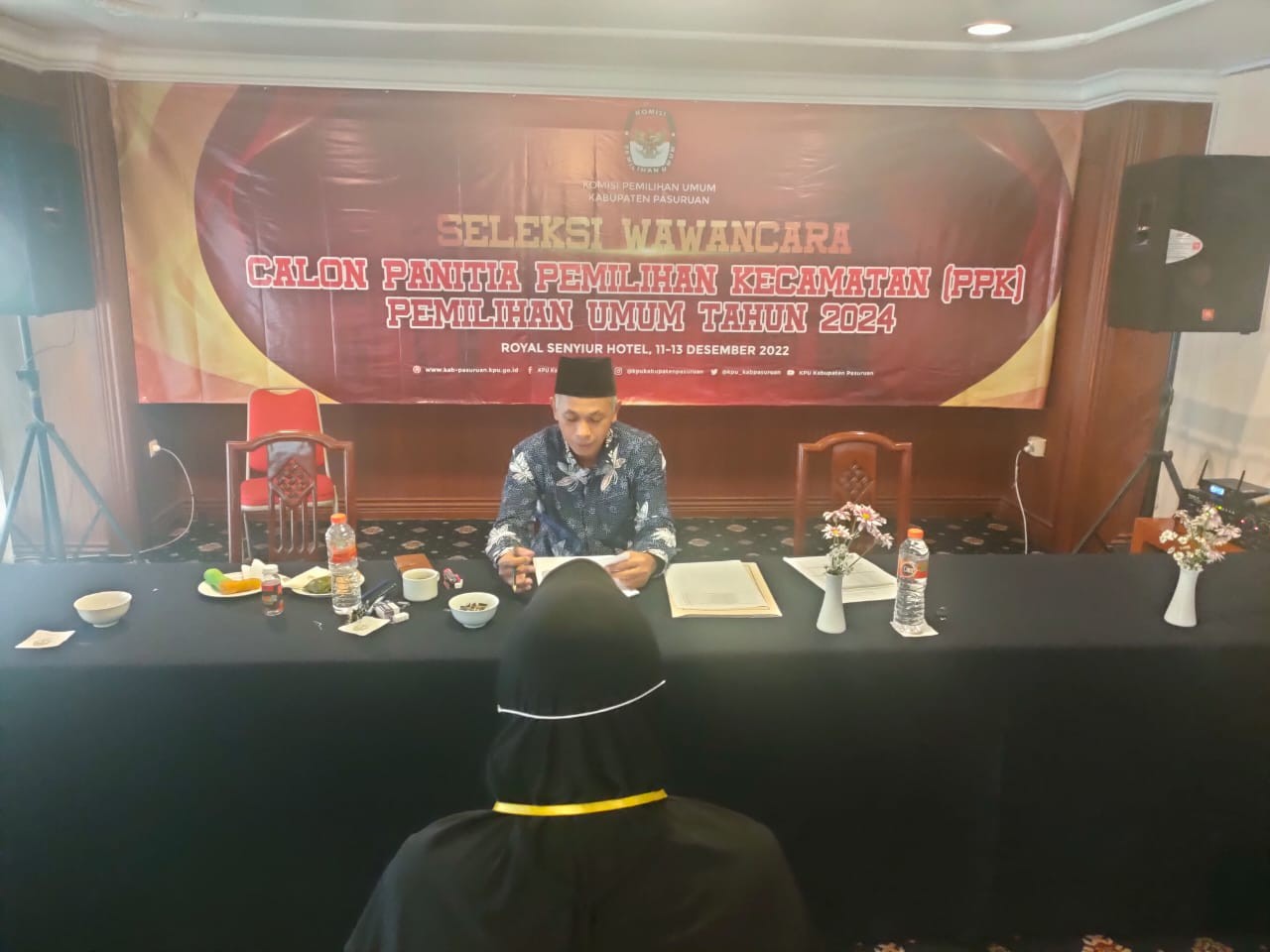 Prigen - https://kab-pasuruan.kpu.go.id , Komisi Pemilihan Umum Kabupaten Pasuruan menyelenggarakan tes wawancara bagi calon anggota Panitia Pemilihan Kecamatan ( PPK ) Pemilu 2024, di Hotel Royal Senyiur, Jl. Putuk Truno No.208, Prigen, Pasuruan. Tes wawancara yang diselenggakan selama 3 hari mulai tanggal 11-13 Desember 2022 dengan total 359 peserta terdiri 265 peserta laki-laki dan 94 peserta perempuan dari 24 kecamatan di wilayah Kabupaten Pasuruan.