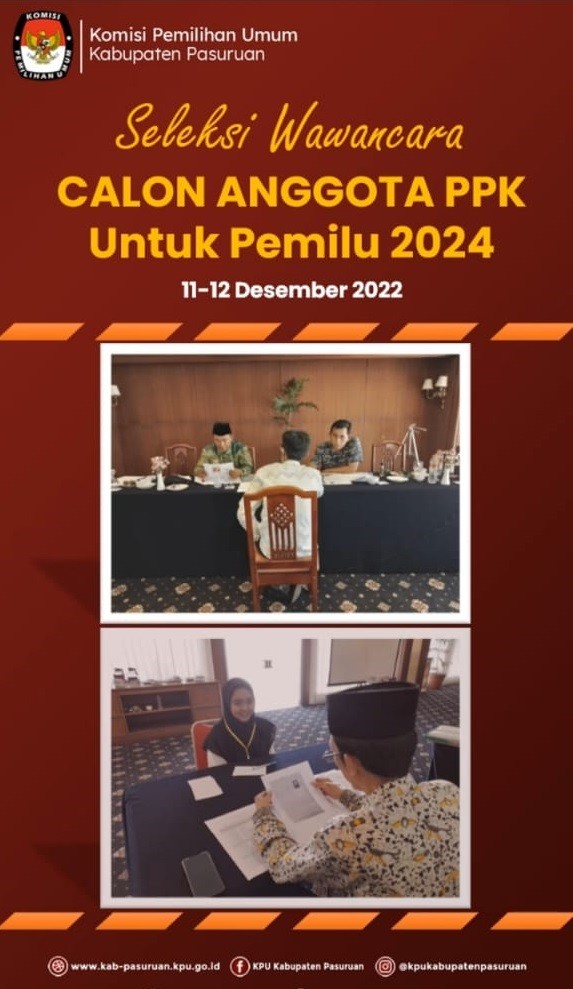 Pada hari pertama, Minggu (11-12-2022), pelaksanaan wawancara yang dilaksanakan mulai pukul 09.00 WIB – 22.00 WIB oleh Ketua KPU Kabupaten Pasuruan bersama anggota dengan peserta dari 8 Kecamatan diantarannya Lumbang, Tosari, Tutur, Puspo, Sukorejo, Purwosari, Pandaan dan Prigen. Pelaksanaan Seleksi wawancara dilakukan untuk mengetahui integritas, loyalitas dan profesionalitas calon anggota PPK, Termasuk untuk memastikan tidak adanya peserta yang berafiliasi dengan partai politik tertentu.