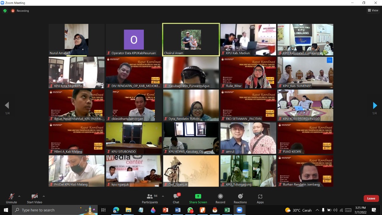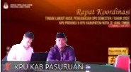 Pasuruan, kab-pasuruan.kpu.go.id - Menindaklanjuti Surat Bawaslu Provinsi Jawa Timur Nomor 187/PM.00.01/K.JI/07/2022 tanggal 5 Juli 2022 Perihal Penyampaian Hasil Pengawasan DPB, KPU Kabupaten Pasuruan mengikuti Rapat Koordinasi Tindak Lanjut Hasil Pengawasan DPB semester 1 tahun 2022 yang diselenggarakan oleh KPU Provinsi Jawa Timur dengan peserta Komisioner Divisi Perencanaan dan Data, Kasubag dan Operator Sidalih dari 38 KPU Kabupaten/kota Se-Jawa Timur, Kamis 7/7/2022.