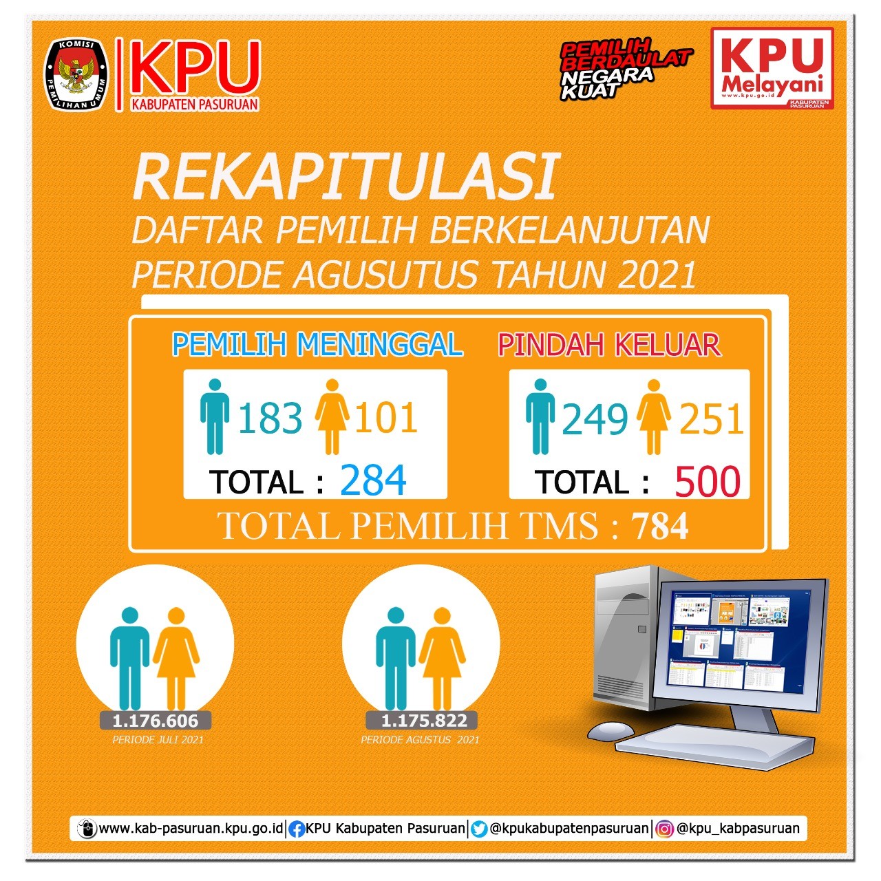 Dipimpin Ketua KPU Kabupaten Pasuruan, Zainul Faizin serta melalui Divisi Perencanaan, Data dan Informasi menyampaikan isi rekapitulasi dalam pleno,bahwa di bulan Agustus ini, pemutakhiran data pemilih secara keseluruhan yang termutakhirkan pada bulan Agustus menjadi 1.175.822 dengan rincian pemilih laki-laki berjumlah 579.188 dan pemilih perempuan berjumlah 596.634, yang tersebar di 18 Kecamatan, terdiri dari 167 Kelurahan/Desa.