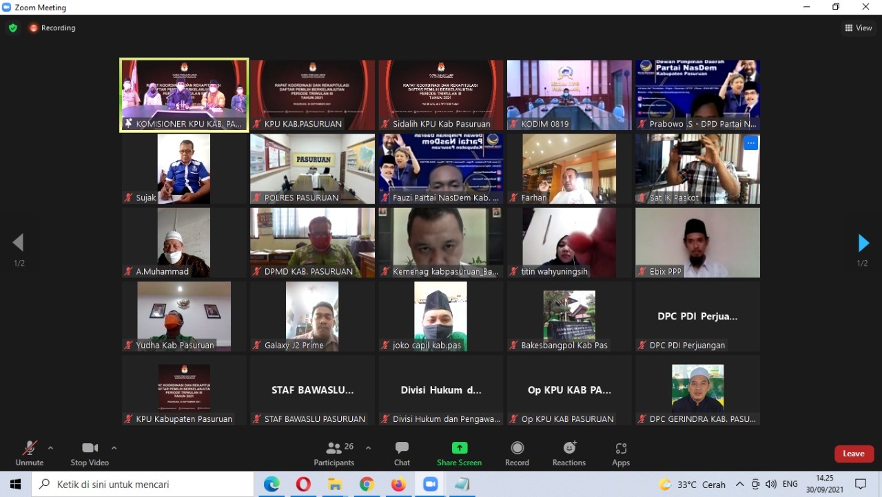 Hadir secara virtual dalam rapat koordinasi, meliputi Bawaslu Pasuruan, Polres Pasuruan, Polresta Pasuruan, Kodim 0819 Pasuruan, Disdukcapil Pasuruan, Bakesbangpol Pasuruan, Kemenag, Dinas Pemberdayaan Masyarakat Desa, serta Pimpinan Partai Politik tingkat Kabupaten.