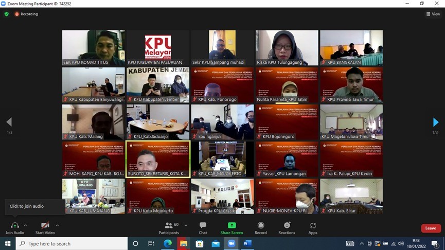 Pasuruan, kab-pasuruan.kpu.go.id - Selasa (19-01-2022) Komisi Pemilihan Umum (KPU) Provinsi Jawa Timur menyelenggarakan kegiatan Penilaian dan Peninjauan Kembali atas Self Asessment Monitoring Pelaksanaan Kegiatan dan Anggaran KPU Kabupaten/Kota se-Jawa Timur. Acara dilaksanakan selama dua hari (18-19 Januari 2021) secara daring melalui zoom meeting, dihadiri Sekretaris dan seluruh Kasubbag dari 38 KPU Kabupaten/Kota se-Jawa Timur.