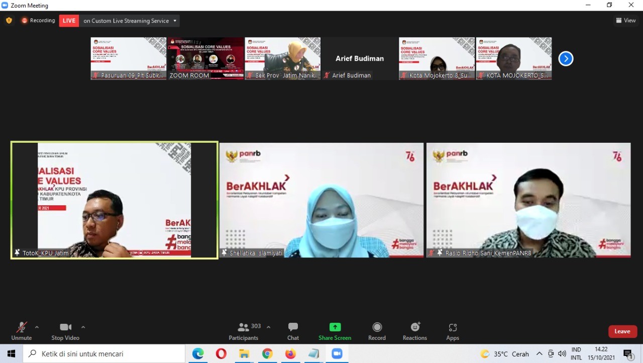 Pasuruan, kab-pasuruan.kpu.go.id - Jumat (15/10/2021) dalam rangka percepatan/transformasi ASN (Aparatur Sipil Negara) yang memiliki budaya kerja yang profesional. Komisi Pemilihan Umum (KPU) Provinsi Jawa Timur menggelar "Sosialisasi Core Value ASN BerAKHLAK (Berorientasi Pelayanan Akuntabel Kompeten Harmonis Loyal Adaptif Kolaboratif) KPU Provinsi dan KPU Kabupaten/Kota se-Jawa Timur secara daring melalui zoom meeting dan kanal Youtube KPU Jawa Timur.