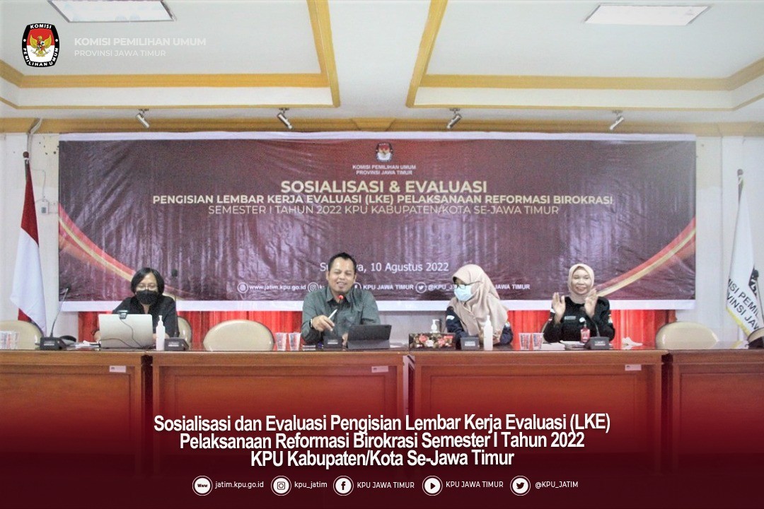 KPU Provinsi Jawa Timur menyelenggarakan kegiatan Sosialisasi dan Evaluasi Pengisian Lembar Kerja Evaluasi Reformasi Birokrasi (LKE RB) Semester I tahun 2022, Rabu( 10 /08/2022 ) mulai Pukul 10.00 WIB. yang dilaksanakan secara daring dengan diikuti oleh TIM Reformasi Birokrasi (RB) dari 38 KPU Kabupaten/Kota Se-Jawa Timur. Adapun tujuan dari kegiatan Sosialisasi dan Evaluasi Reformasi Birokrasi ini adalah untuk mengetahui hasil capaian output dari KPU Kabupaten/Kota dalam tiap semester yang telah dicapai.