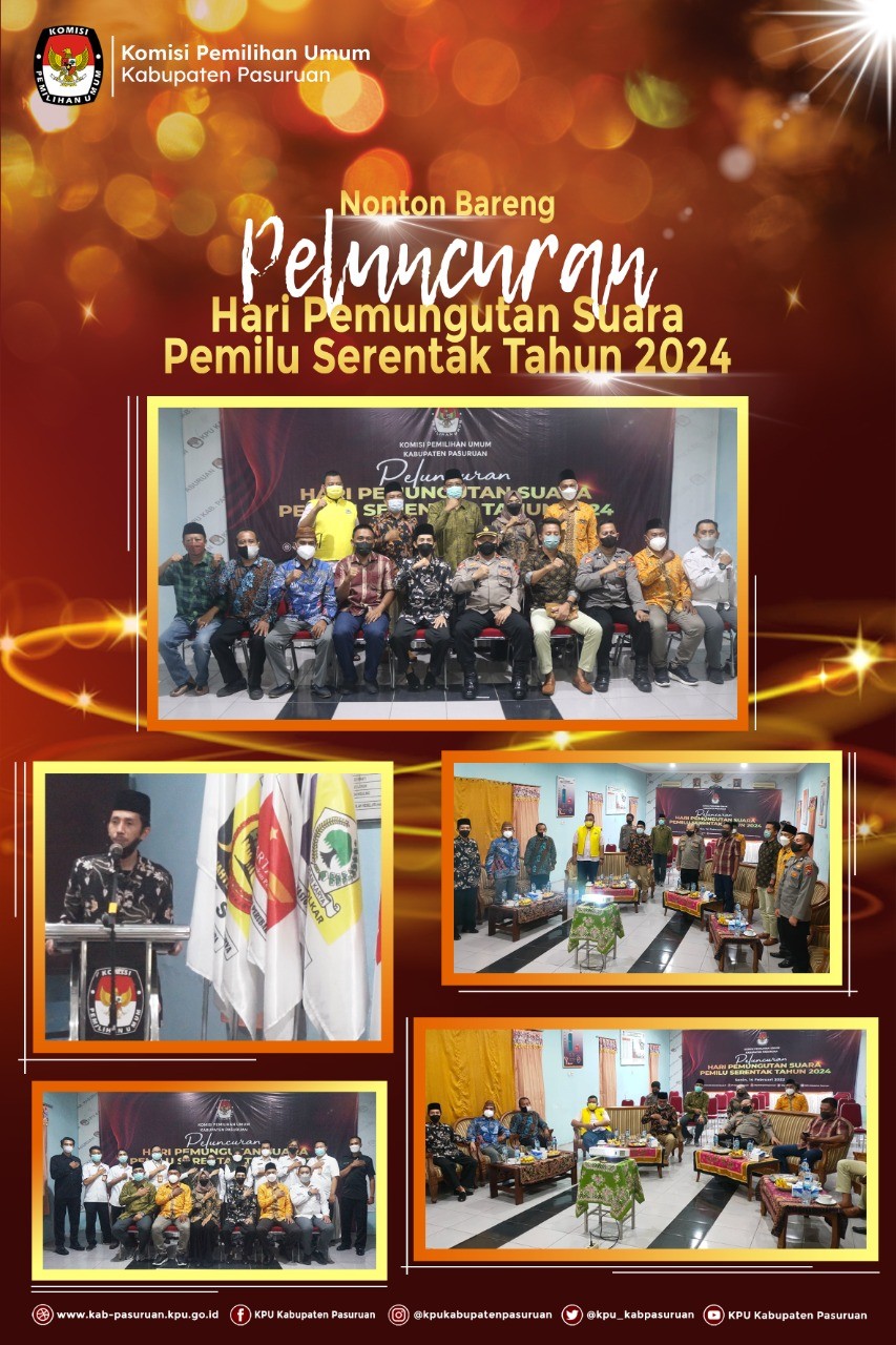 Bertempat di Gedung Serba Guna KPU Kabupaten Pasuruan, mulai pukul 19.00 WIB Ketua, Anggota dan Sekretariat KPU Kabupaten Pasuruan, bersama jajaran Forkompimda, Bawaslu serta Partai Politik di wilayah Kabupaten Pasuruan mengikuti acara peluncuran hari pemungutan suara pemilihan umum serentak tahun 2024 melalui live streaming di kanal Youtube KPU RI yang dikemas dalam konsep Nonton Bersama.