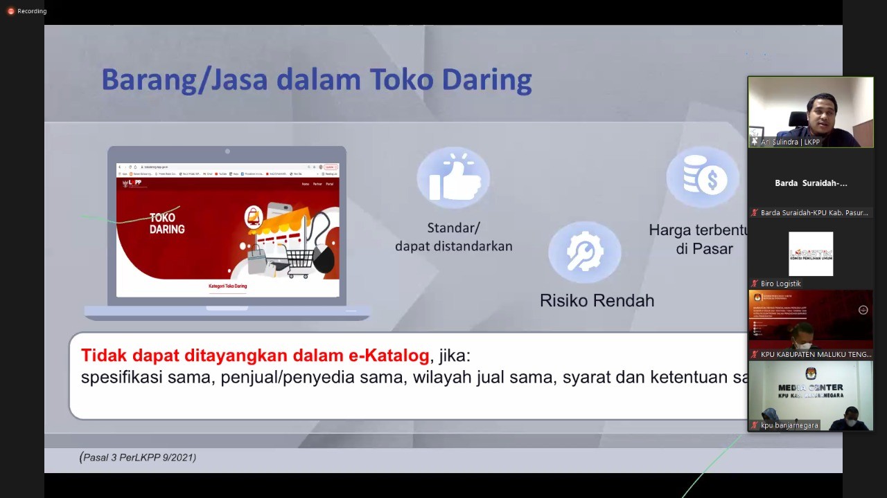 Pasuruan, kab-pasuruan.kpu.go.id – Guna mengakomodasi usulan KPU Provinsi dan KPU Kabupaten/Kota serta untuk meningkatkan kompetensi, KPU RI mengadakan bimbingan teknis (bimtek) dengan pokok bahasan ‘Pendalaman Peraturan LKPP Nomor 9 Tahun 2021 tentang Toko Daring dan Katalog Elektronik dalam Pengadaan Barang/Jasa Pemerintah’. Kegiatan dilaksanakan mulai pukul 09.00 WIB via zoom meeting diikuti oleh Pejabat Pembuat Komitmen (PPK) dan Pejabat Pengadaan Barang dan Jasa (PBJ) KPU Provinsi, Kabupaten/Kota seluruh Indonesia (28/09/2021).