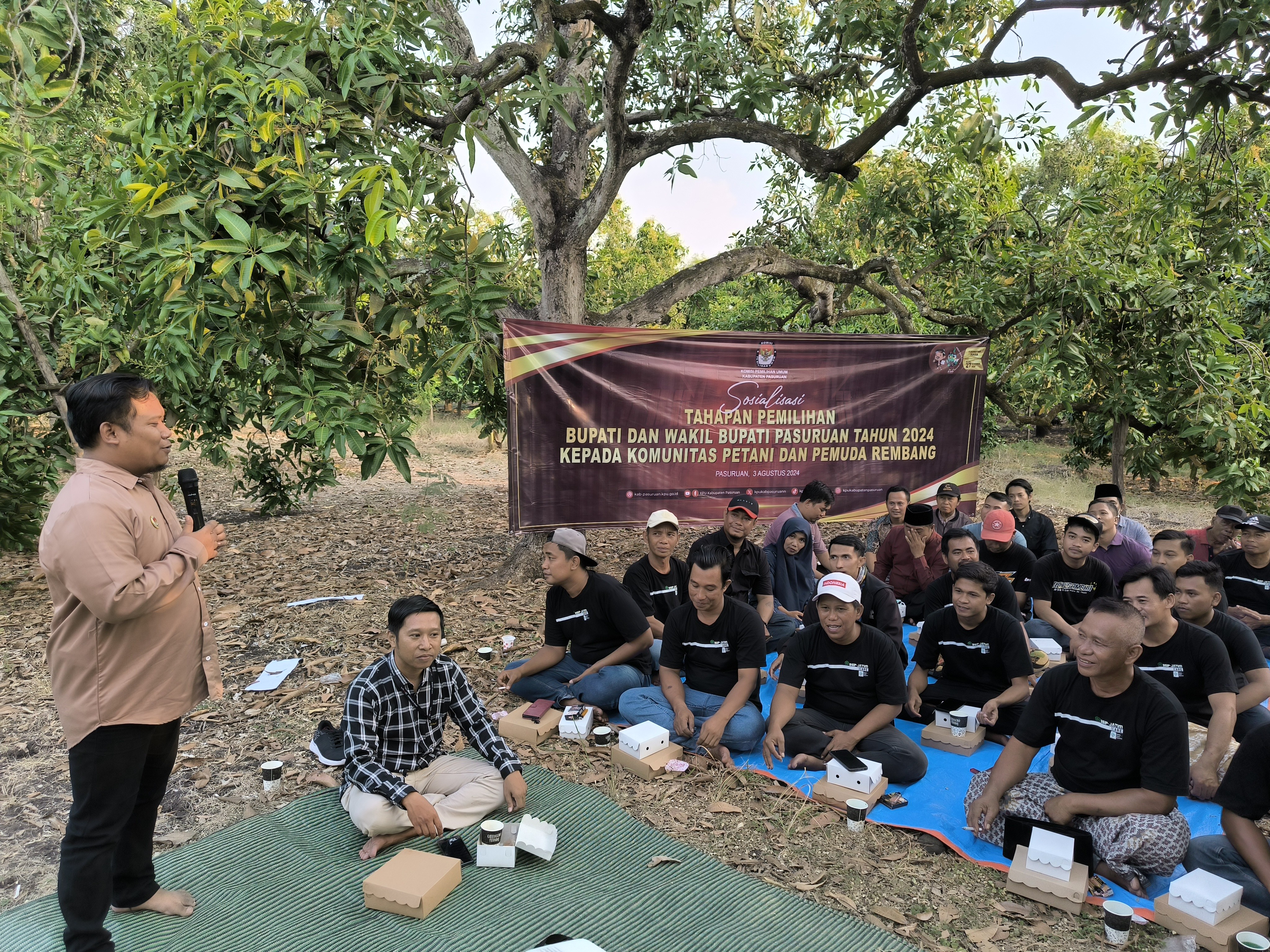 kab-pasuruan.kpu.go.id - Komisi Komisi Pemilihan Umum (KPU) Kabupaten Pasuruan gelar Sosialisasi Tahapan Pemilihan Bupati dan Wakil Bupati Pasuruan Tahun 2024 kepada Komunitas Petani dan Pemuda Rembang. Sabtu, (03/08/2024). Bertempat di Kebun Mangga Rokunci, Oro – oro Ombo Wetan, Kecamatan Rembang - Pasuruan.