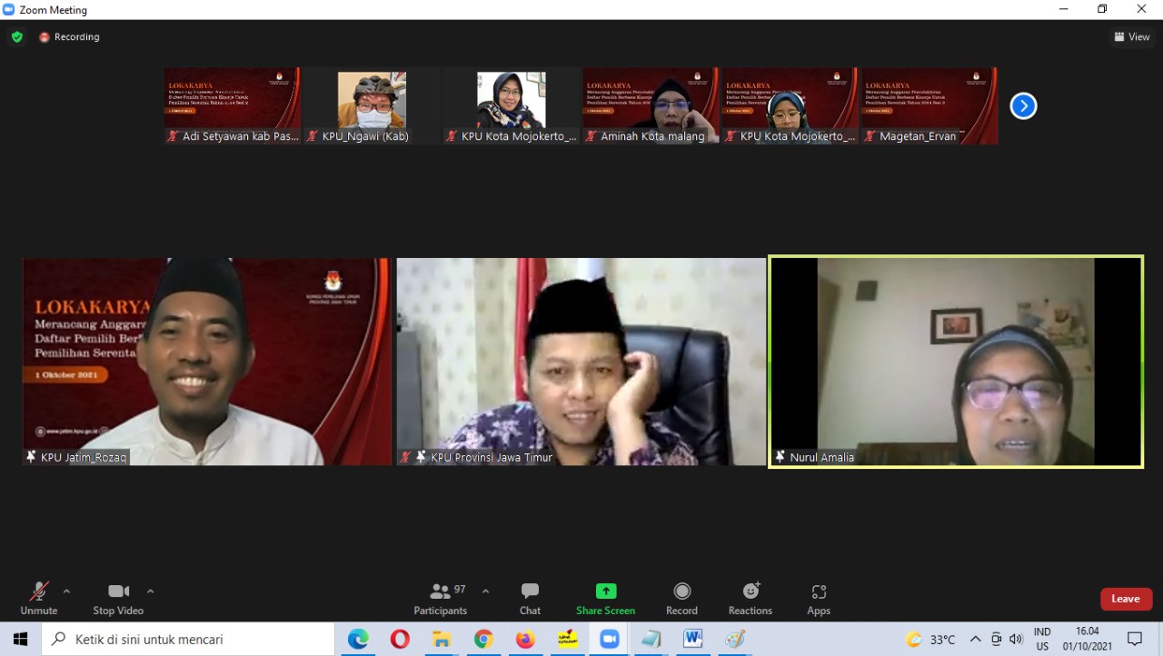 KPU Kabupaten Pasuruan secara virtual mengikuti lokakarya sesi 2, antara lain Zainul Faizin (Ketua KPU), Abdul Kholiq (Divisi Perencanaan, Data dan Informasi, serta Feni Yudi Ariyanto (Sub Koordinator Program dan Data).