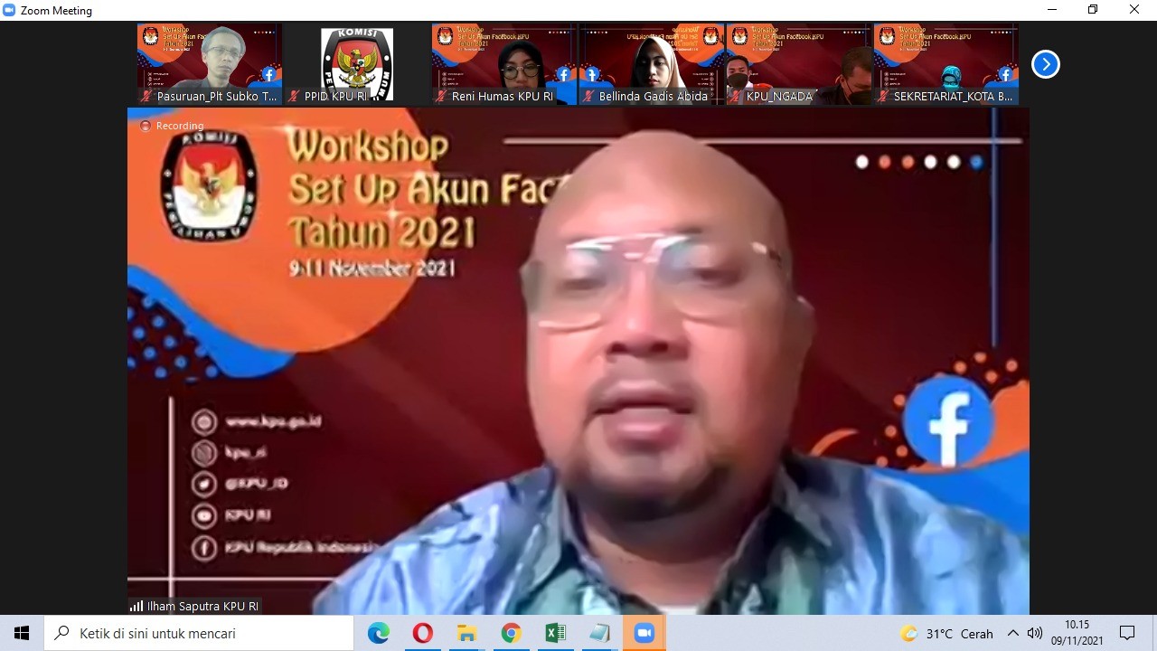 Pasuruan, kab-pasuruan.kpu.go.id - Rabu (09-11-2021) KPU RI adakan workshop setup akun facebook bagi lembaga pemerintah, acara yang diadakan selama 3 (tiga) hari dan dilaksanakan secara daring via zoom meeting ini dibagi menjadi 3 (tiga) gelombang, dan KPU Kabupaten Pasuruan sendiri berada di gelombang I sesuai surat undangan KPU RI Nomor 1101/HM.02/09/2021 tanggal 3 November 2021. Hadir yang mengikuti acara adalah Adi Setyawan selaku Plt. Kepala Sub Bagian Teknis dan Partisipasi Masyarakat KPU Kabupaten Pasuruan.