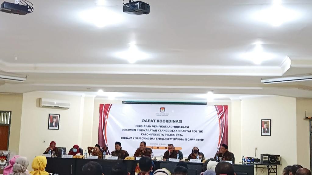 Pasuruan, kab-pasuruan.kpu.go.id Menjelang pelaksanaan Verifikasi Administrasi Calon Peserta Pemilu tahun 2024, KPU Propinsi Jawa Timur melakukan Rapat Koordinasi (Rakor) Persiapan Verifikasi Administrasi Dokumen Persyaratan Keanggotaan Partai Politik Calon Peserta Pemilu 2024, Jum’at (12/08/2022) bertempat di Aula kantor KPU Kabupaten Sidoarjo mulai pukul 15.00 WIB.